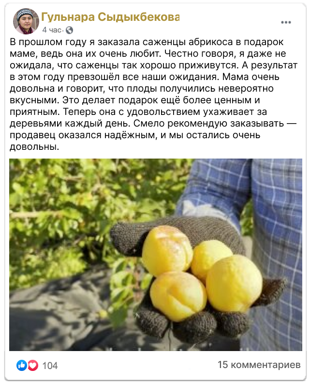 Мы ценим каждого клиента и хотим, чтобы к нам возвращались, поэтому мы продаем саженцы высокого качества с максимальным процентом приживаемости в любой точке Кыргызстана.