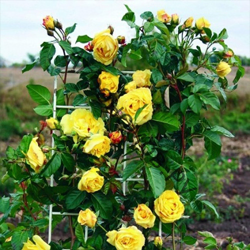 Цветки крупные, 10-11 см, лучше всего выглядит полностью распустившись, когда масса мелких темно-желтых внутренних лепестков контрастирует с более бледными и крупными внешними. Цветки обычно появляются по одному, как у чайно-гибридных роз, в первом цветении, и кистями, как у Флорибунт, повторная. Аромат довольно насыщенный, фруктовый. Куст прямостоячий, зимостойкий, с крупной блестящей листвой, достигает 3-4 м. Бутоны удлиненно-заостренные. Цветки лимонно-желтые, красивой бокаловидной формы, крупные 8-9 см. Махровые (40 лепестков), душистые (чайные). Лепестки широкие, а к центру уже мельче, одиночные или в небольших соцветиях по 3-5. Листья темно-зеленые, очень блестящие. Шипы крупные. Кусты свыше 2 х метров высотой. Цветения обильные, хорошо повторяющиеся.